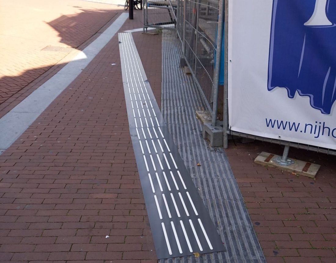 Dalles podotactiles/de guidance provisoires pour personnes déficientes visuelles aux abords d'un chantier dans la zone piétonne de la ville de Dordrecht, plus vieille ville de Hollande.J'ai du mal à me rendre compte à quel point cette solution low-tech représente une alternative suffisamment "crédible" pour les utilisateurs concernés mais cela illustre un véritable enjeu des chantiers … Lire la suite Vu à Dordrecht : dalles podotactiles provisoires