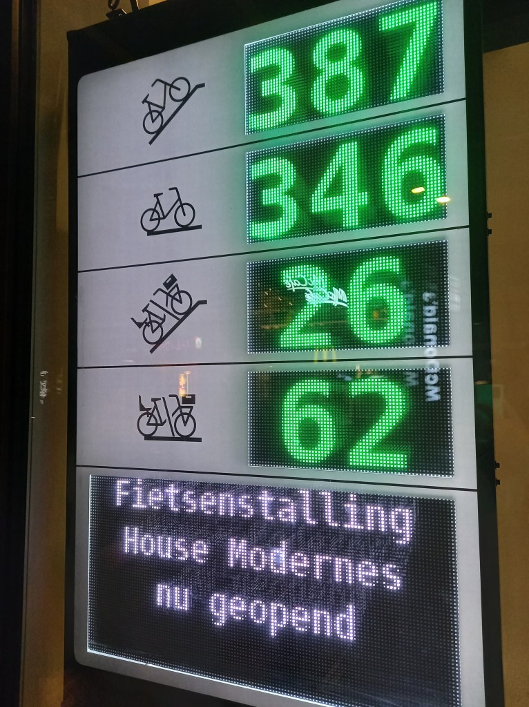 Si le premier jour de stationnement est gratuit, comptez ensuite 1,25 EUR/jour avec une durée maximale limitée. Cela permet un taux de rotation minimum et évite l’accumulation de vélos « ventouses ». L’abonnement annuel, incluant l’accès à tous les parkings municipaux surveillés, revient à 80 EUR/an. Pays-Bas obligent, la gestion des accès et le paiement se font grâce à l’OV-Chipkaart, la carte nationale de transport. On notera que le vélo connait un tel succès qu’en certains endroits du centre-ville, il devient parfois difficile, en tant que piéton, de circuler aisément sur les trottoirs et ce, à cause des très nombreux vélos stationnés en voirie (limites du système ?).