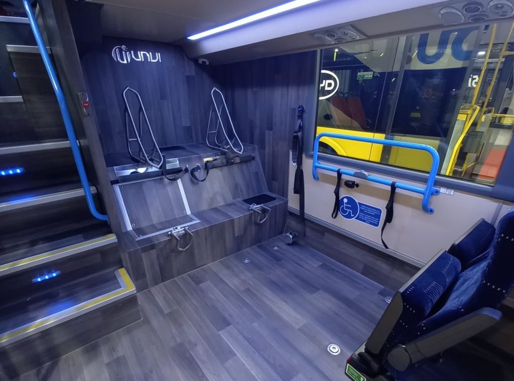 Le BYD-UNVI DD13 du constructeur chinois BYD pour la Région Sud, équipé de racks à vélos à l’intérieur même du véhicule, juste à côté de l’emplacement PMR. Surprenant.