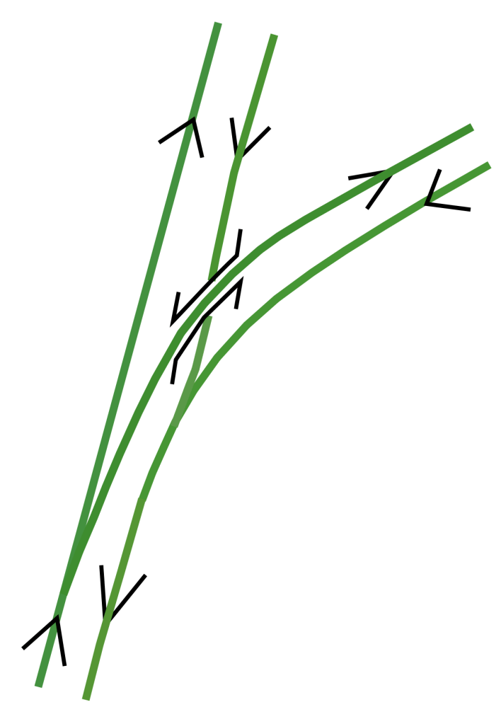 Cette conception s’inspire du concept ferroviaire de « saute-mouton » (flyover en anglais). Il s’agit d’une infrastructure où une voie passe au-dessus ou en dessous d’une autre pour éviter les conflits de circulation, améliorer la sécurité et augmenter la capacité et la vitesse autorisée.