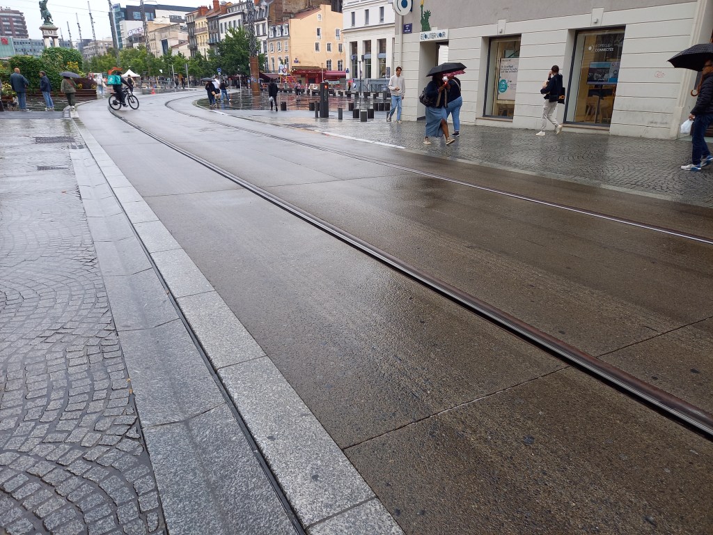 Entre deux volcans, passage obligé par la capitale régionale : Clermont-Ferrand. Dans la cité de Michelin, le tramway roule, évidemment, sur pneus.