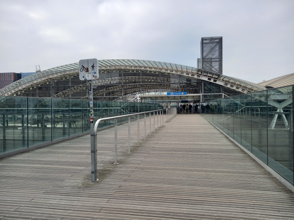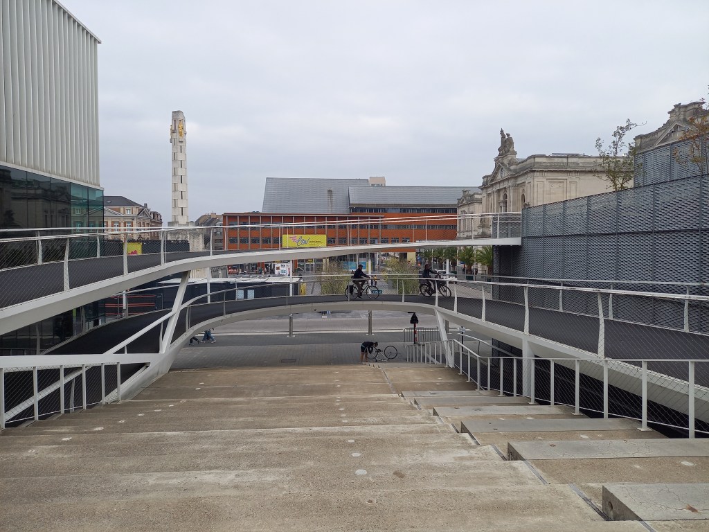 En matière de mobilité cyclable, s’il y a bien une pépite belge que je retiens, c’est le pont cyclable de la gare de Leuven. Cette passerelle cyclo-piétonne traverse la gare et permet aux cyclistes de franchir les voies sans devoir poser pied à terre. Sa conception évite efficacement les conflits potentiels avec les usagers SNCB et permet de réserver le couloir sous-voies aux piétons sans contraindre les flux cyclistes. Son accès se fait par une rampe en spirale, suspendue au-dessus d’un large escalier.