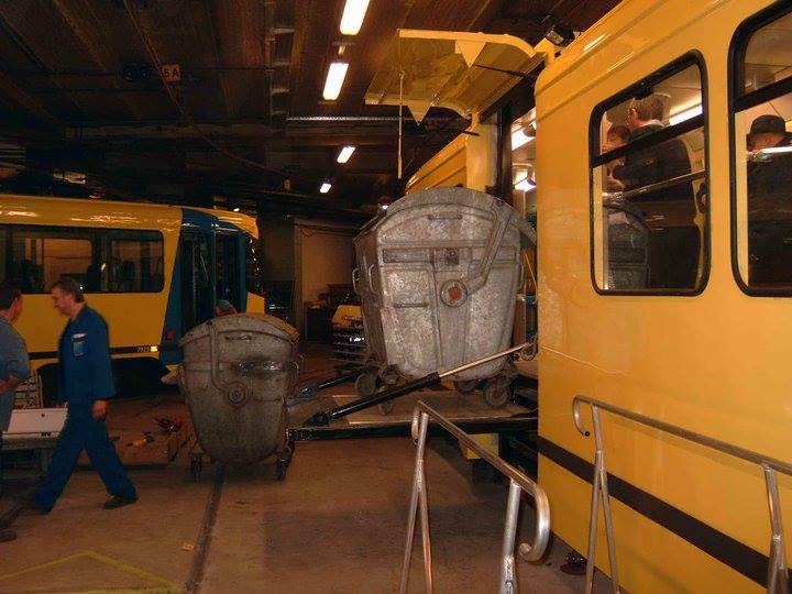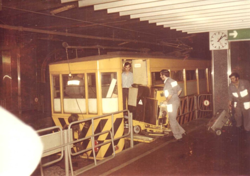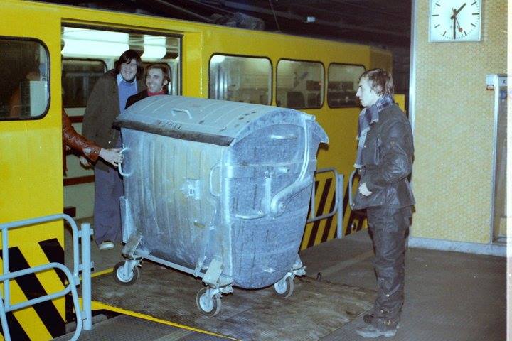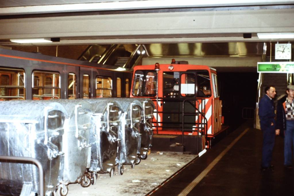 À la mise en service du réseau métro en 1976, la vidange des poubelles en station se faisait grâce à un train de travaux composé d’un wagon plat encadré de deux locotracteurs.