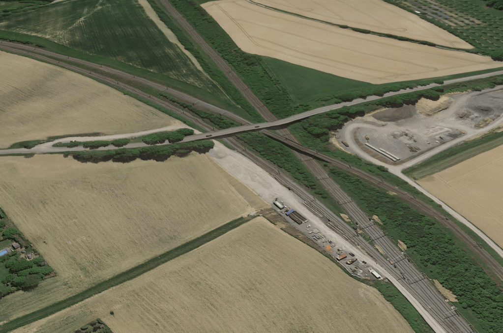Configuration d’infrastructure où deux itinéraires de circulation se croisent au même niveau, obligeant un train à couper la trajectoire d’un autre train pour poursuivre sa route.