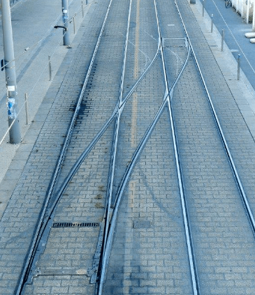 Franchir l’aiguillage en arrivant du côté des pointes, là où les lames mobiles se séparent pour diriger le véhicule vers l’une ou l’autre direction.